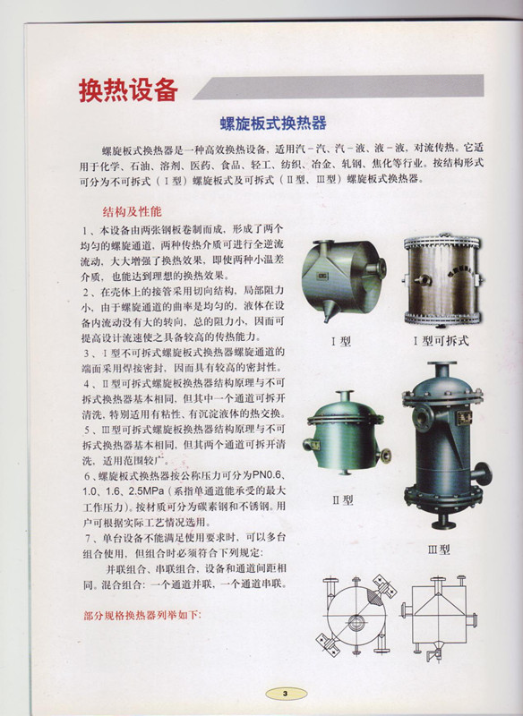 产品简介:螺旋板式换热器是一种高效换热设备,适用汽-汽、汽-液、液-液,对液传热。它适用于化学、石油、溶剂、医药、食品、轻工、纺织、冶金、轧钢、焦化等行业。按结构形式可分为不可拆式(I型)螺旋板式及可拆式(Ⅱ型、Ⅲ型)螺旋板式换热器。